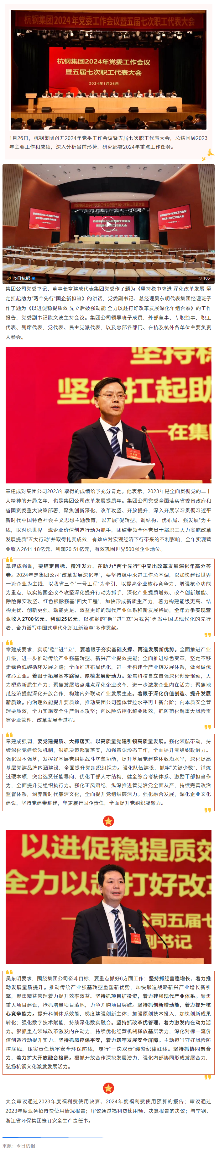 杭鋼集團(tuán)召開2024年黨委工作會(huì)議暨五屆七次職工代表大會(huì)發(fā)布日期:2024-01-26